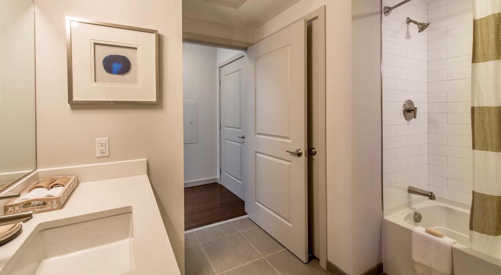 • a bathroom with a shower and a sink