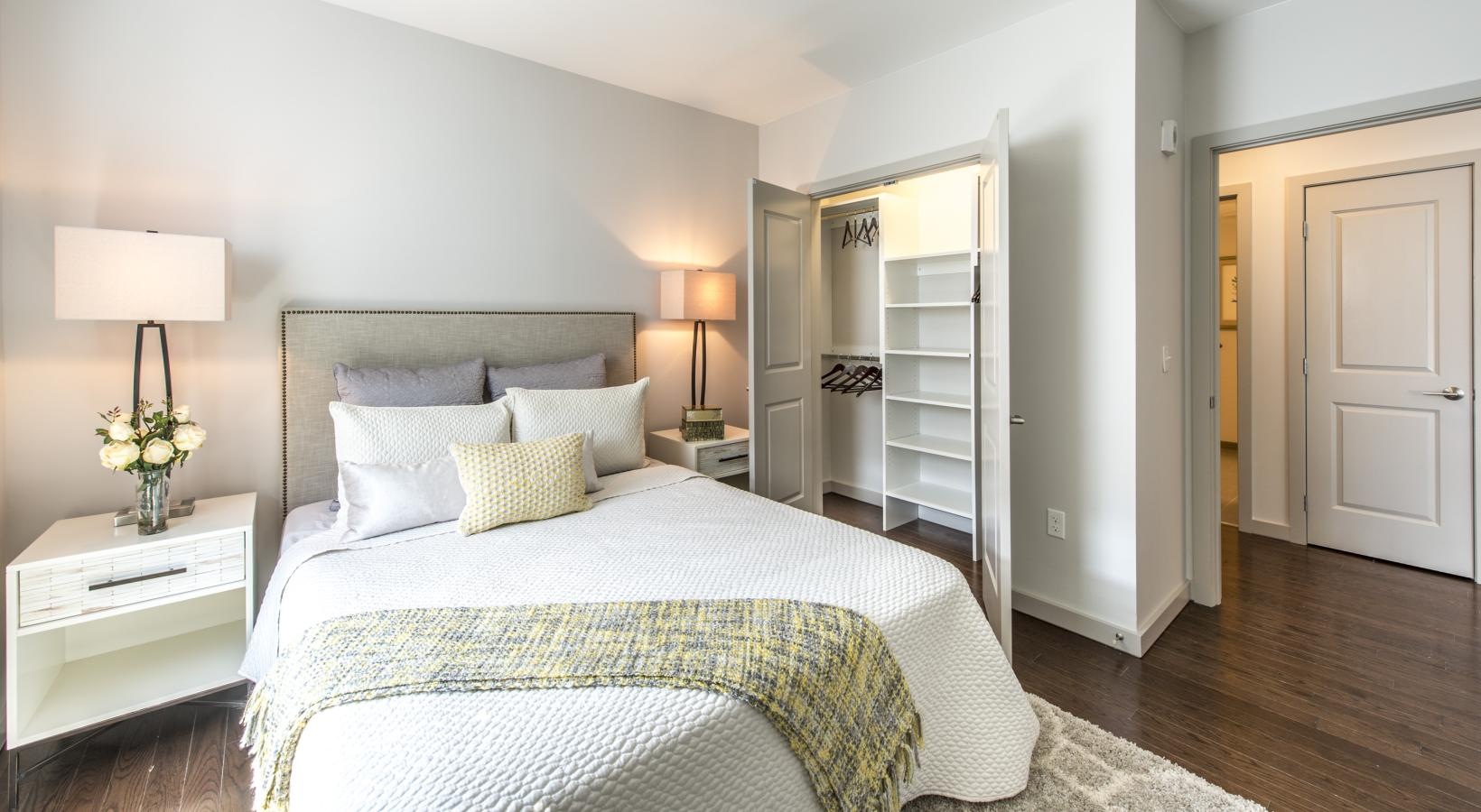 • a bedroom with a bed and a closet