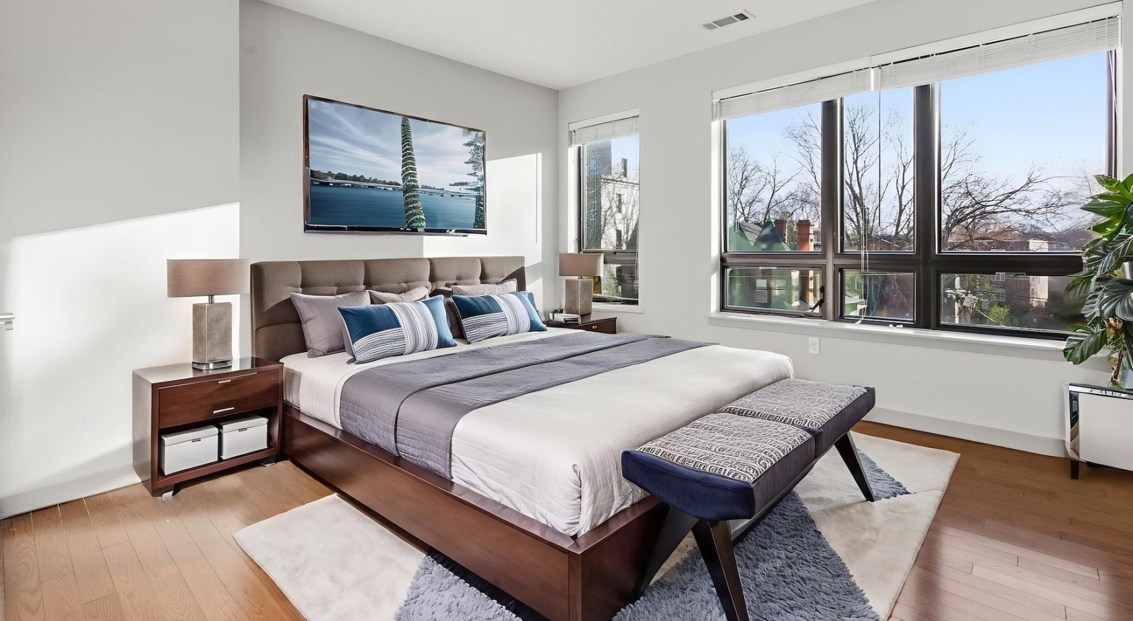 • a bedroom with a bed and a large window