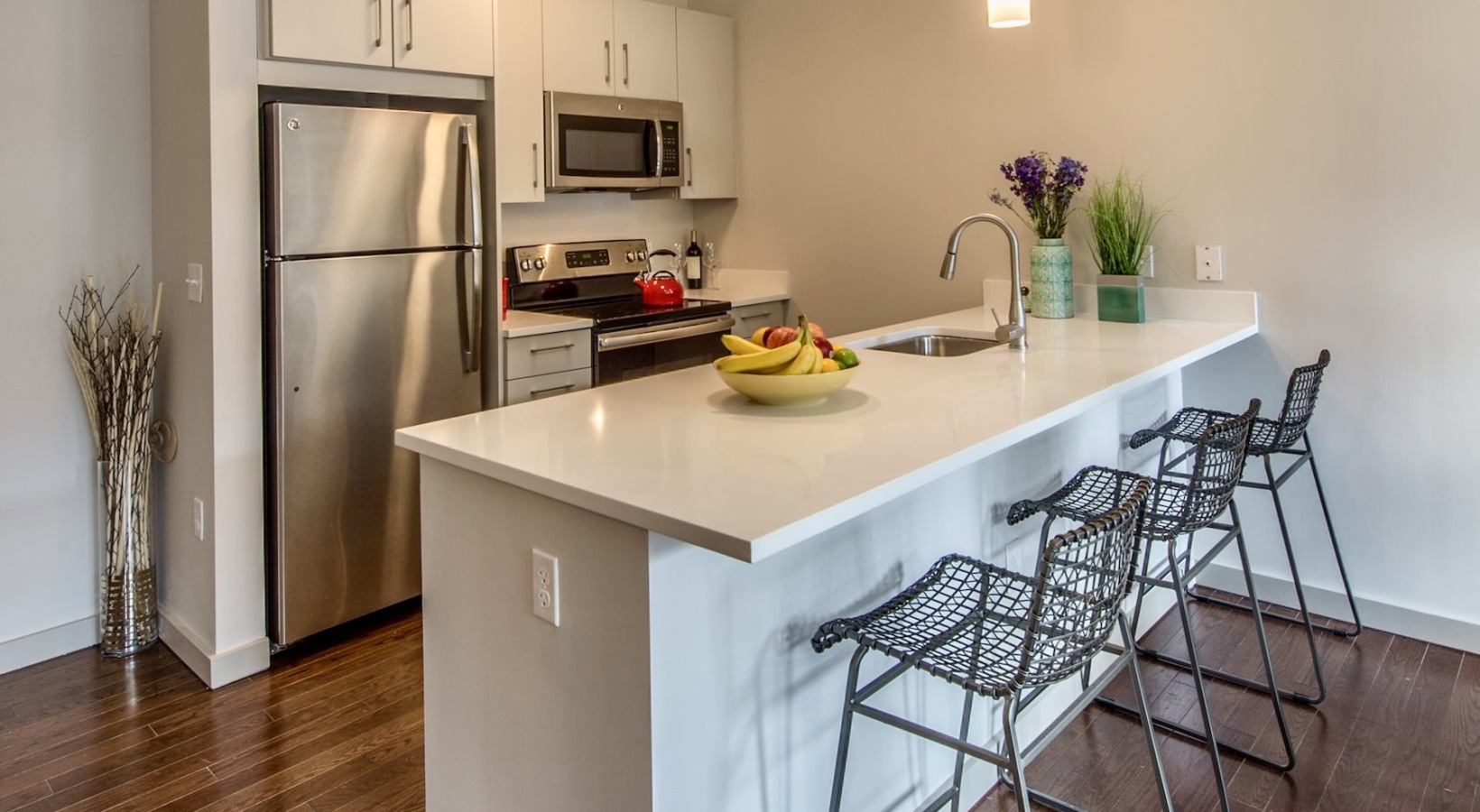 • a kitchen with white cabinets